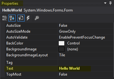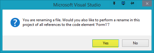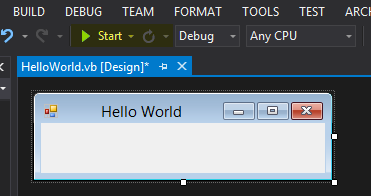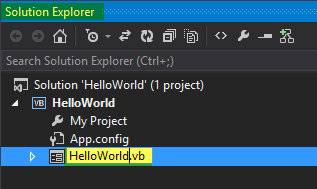In Solution Explorer, R-click the file named "Form1.vb" and rename it to HelloWorld.vb. The form is an object. It is extremely important to name objects (forms and other controls) as early as possible. Also, it is advisable to not change object names after code has been written using the objects. Doing so can break references that have been established in code.