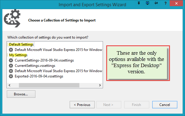 This is what the next dialog box looks like when using the Community, Professional, or Ultimate versions of Visual Studio. The Express for Desktop version options are shown in the second dialog. Select the new language setting.