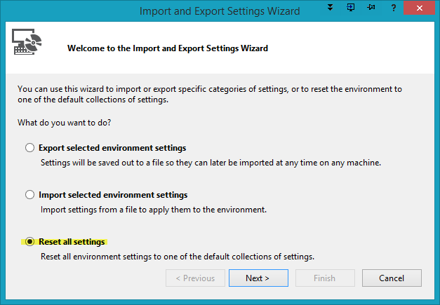 On the Tools menu select "Import and Export Settings". Select "Reset all settings".