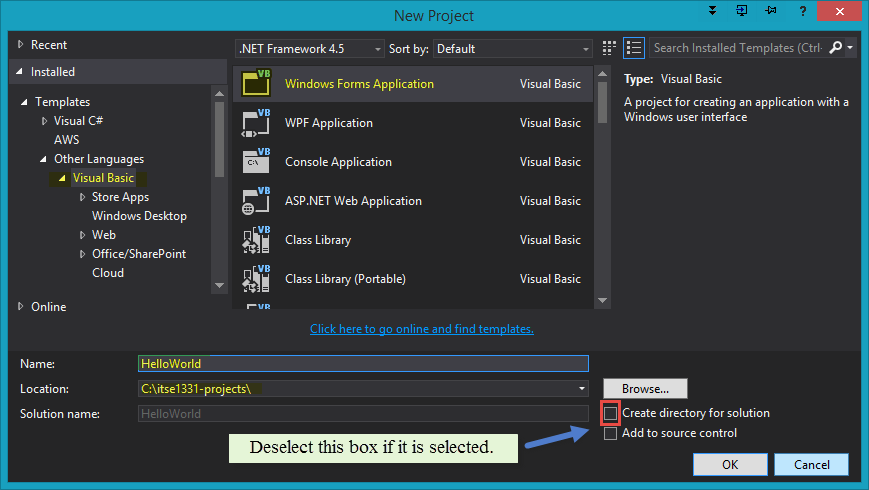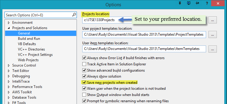Select the default location of your projects and the “Save new…” box as shown. Note: Even though MSDN describes the "Projects location:" as being the default location of new projects, the "last used" evidently overrides this setting. By the way, ALWAYS save and run your Visual Studio projects from a directory on the C:\ drive. At some point, your programs will have problems if you attempt to run from a network drive or a flash drive. You can SAVE your programs to those locations if you need to. But copy and run them from C:\.