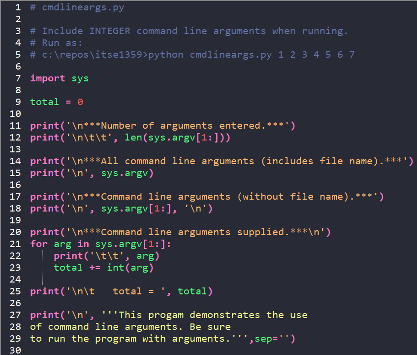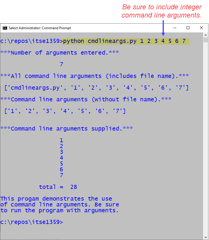 The code below demonstrates the use of command line arguments. The sys module is imported on line 7 since it is required to process the arguments. Command line arguments are entered into a list of strings which includes the filename. The output from line 15 shows the filename. However, when we don't want to process the filename, we use sys.argv[1:] to skip the zeroeth element of the list and start with the first. This technique is shown on lines 12, 18, and 21. On lines 21-23, a for loop is used to process each argument entered. Each argument is added to total which is diplayed on line 25.
