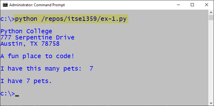 To run the program, open a command prompt and type: python /repos/itse1359/ex1.py <ENTER>. See the output below and verify that it agrees with the ex-1.py code listing.
