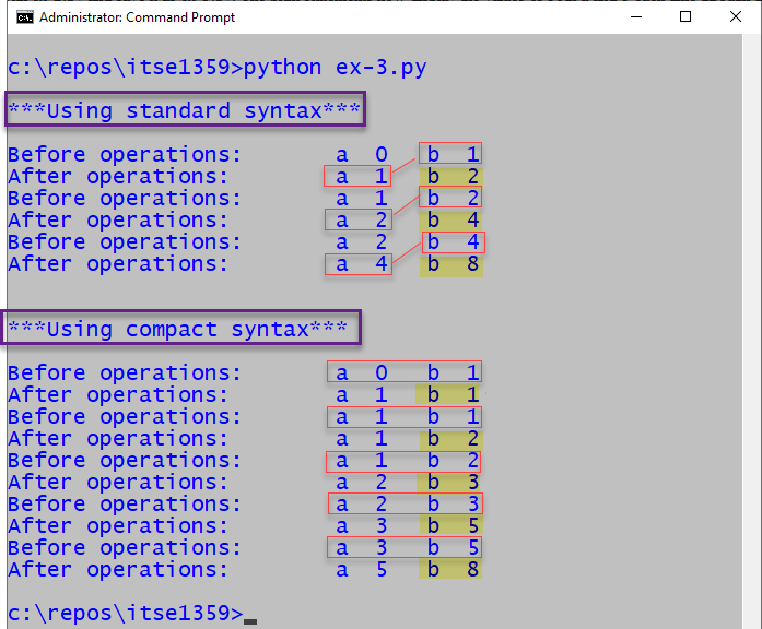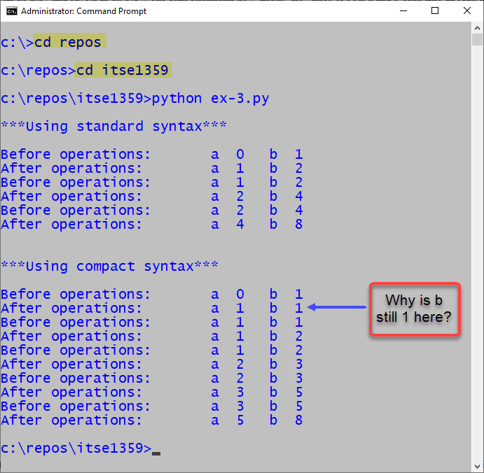 Observe in the annotated version of the output below that, when using standard syntax, the after operations version of the variable a is used in the expression b=a+b which is as expected.