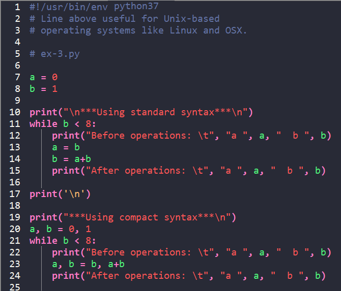 Like in the first while loop, the second while loop will be executed while 'b < 8'. On line 20 compact syntax is used to assign a the value of 0 and b the value of 1. In this case, compact syntax is not an issue.