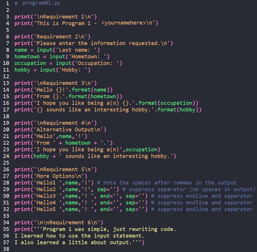 Lines 30-32 demonstrate suppression of both the separator and end-of-line characters. Notice the effects in the output. Also, notice how "Requirement #'s" are printed in the output to identify the requirements that are being met. See Blackboard for information about program requirements.
