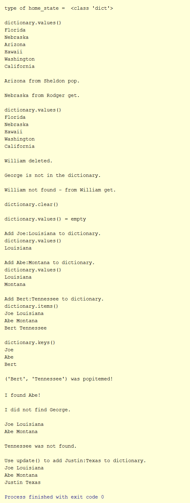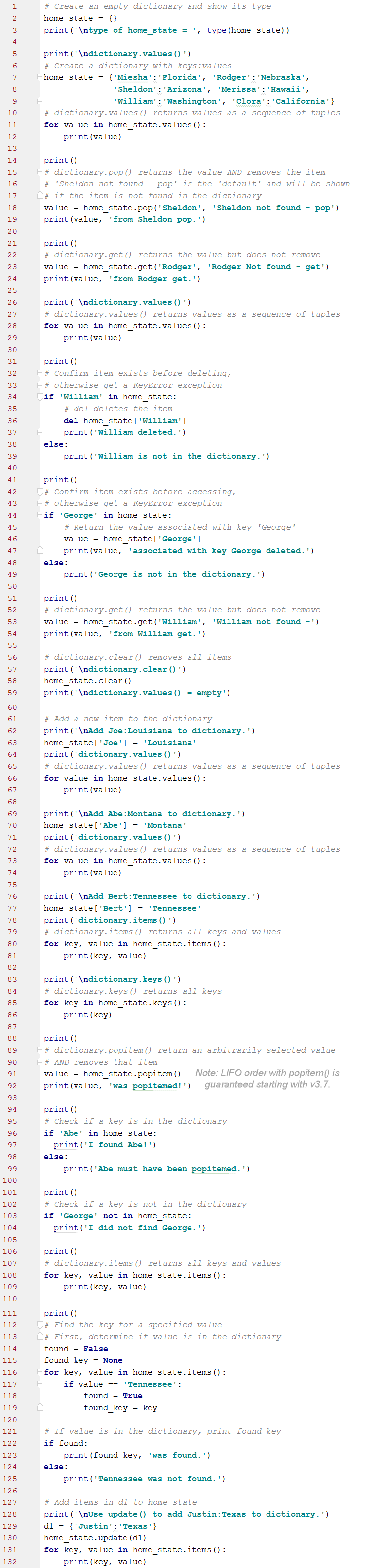 Code dictionary.py in PyCharm as shown. The comments in the code and annotations in the output describe the operations being demonstrated. All of the operations in the table above are shown in the code example below. Confirm your understanding by closely comparing the code with the output it produces.
