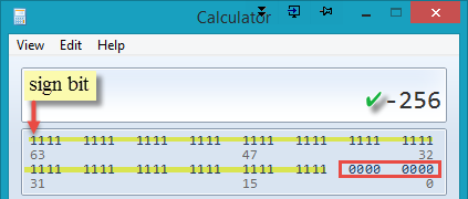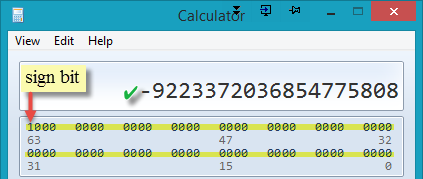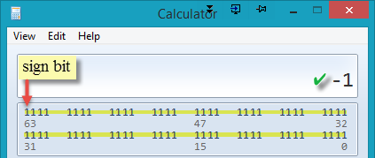 With the sign bit set to '1', the number will be negative. Notice that when all bits are set, the value is -1 which is the highest value negative integer. Note that when bit 63, the highest bit is set, the result will be a negative number.