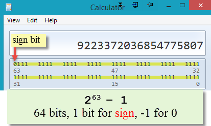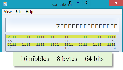 In the image below, notice with the calculator set to display hexadecimal numbers that 9223372036854775807 = 7FFFFFFFFFFFFFFF. Each of the four bits is called a nibble. Eight bits = one byte. There are a total of 64 bits used to represent a 'signed' variable on a 64-bit machine running a 64-bit operating system.