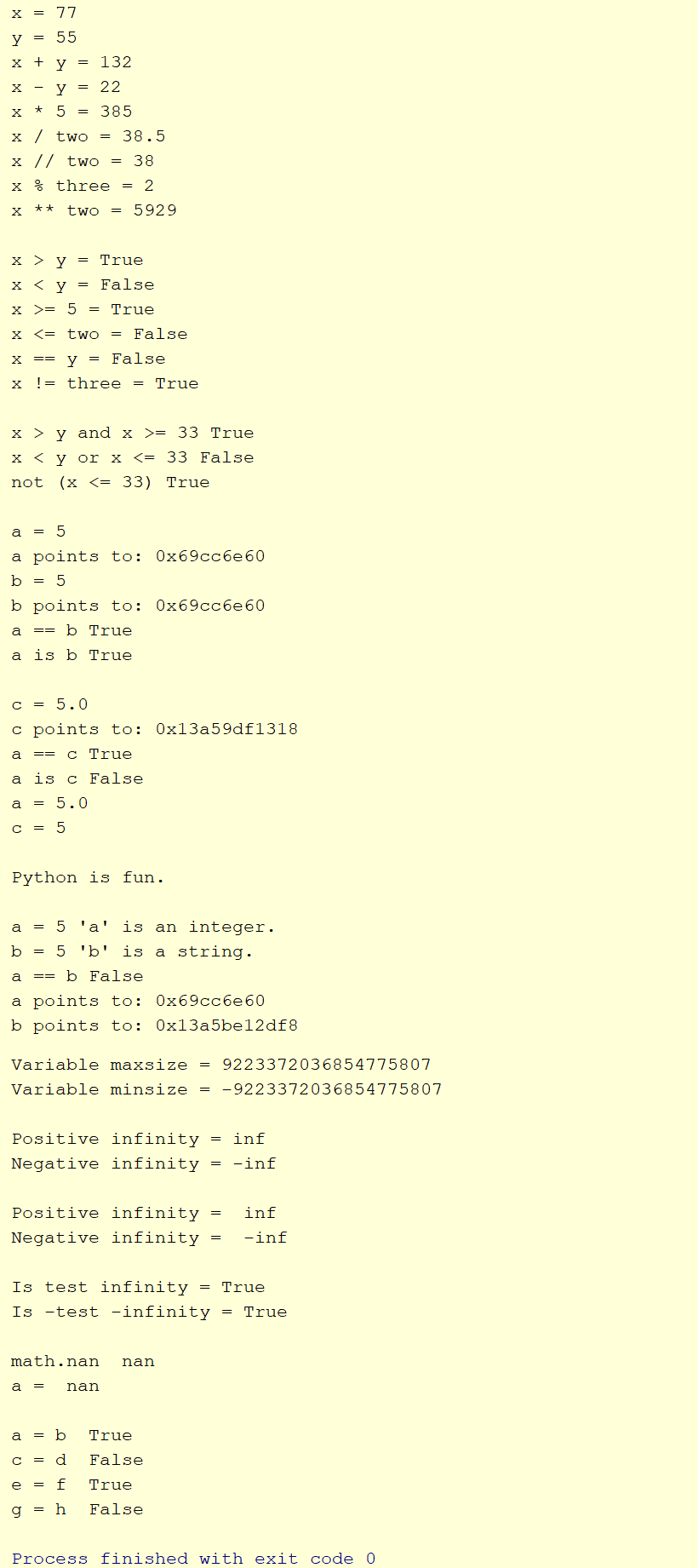 Lines 118 - 137 contain a few additional operations to consider related to the numbers data type. Positive Infinity and negative infinity are useful to test for extreme range values without guessing or supplying artificially high/low numbers. NaN (not a number) is useful to determine if an operation returns a valid number. See this link for more on these topics.