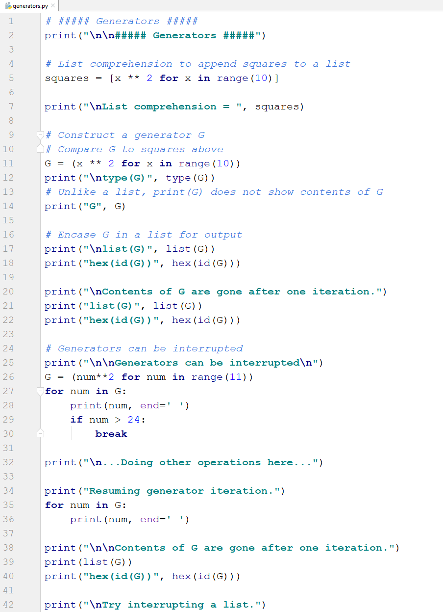 - List values are stored and generator values are computed on the fly and therefore require minimal memory.