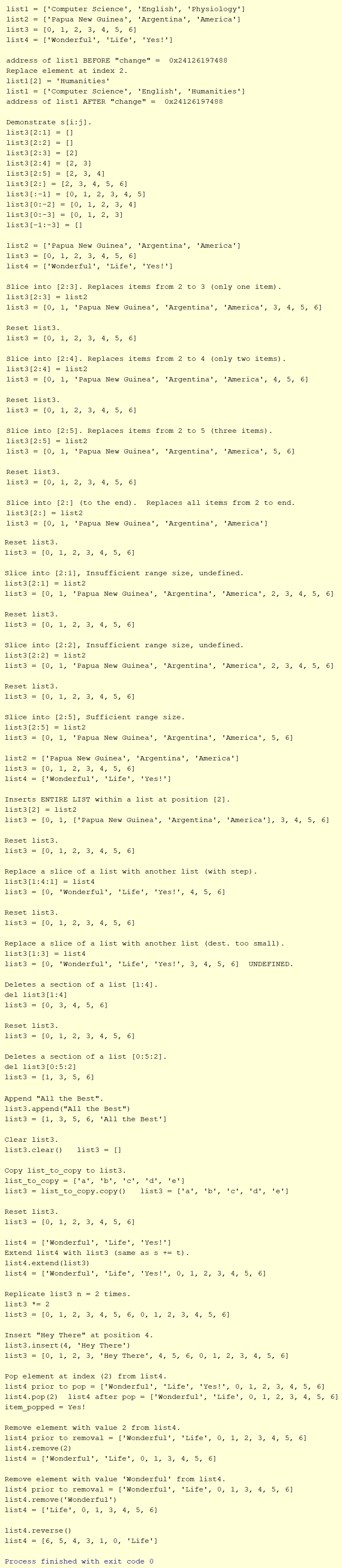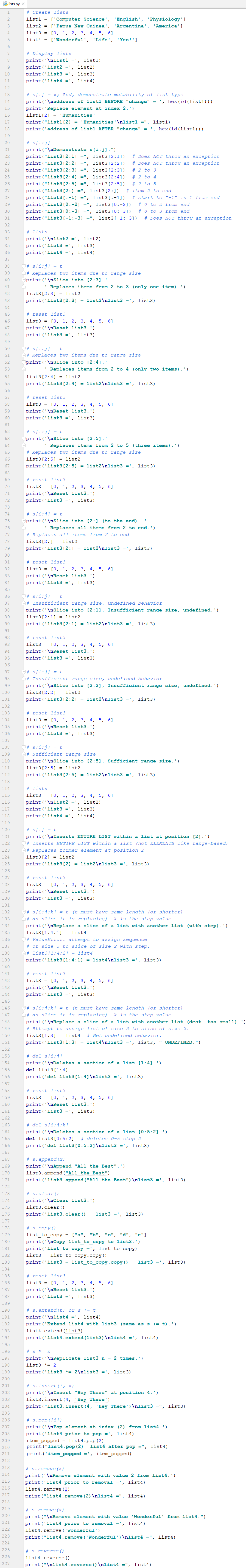 In the code example below, lists are created and used to demonstrate the operations in the table above. s.copy() is covered more thoroughly in the chapter Copy Operations. Students are encouraged to extensively experiment with sequence operations using strings, tuples, and lists.