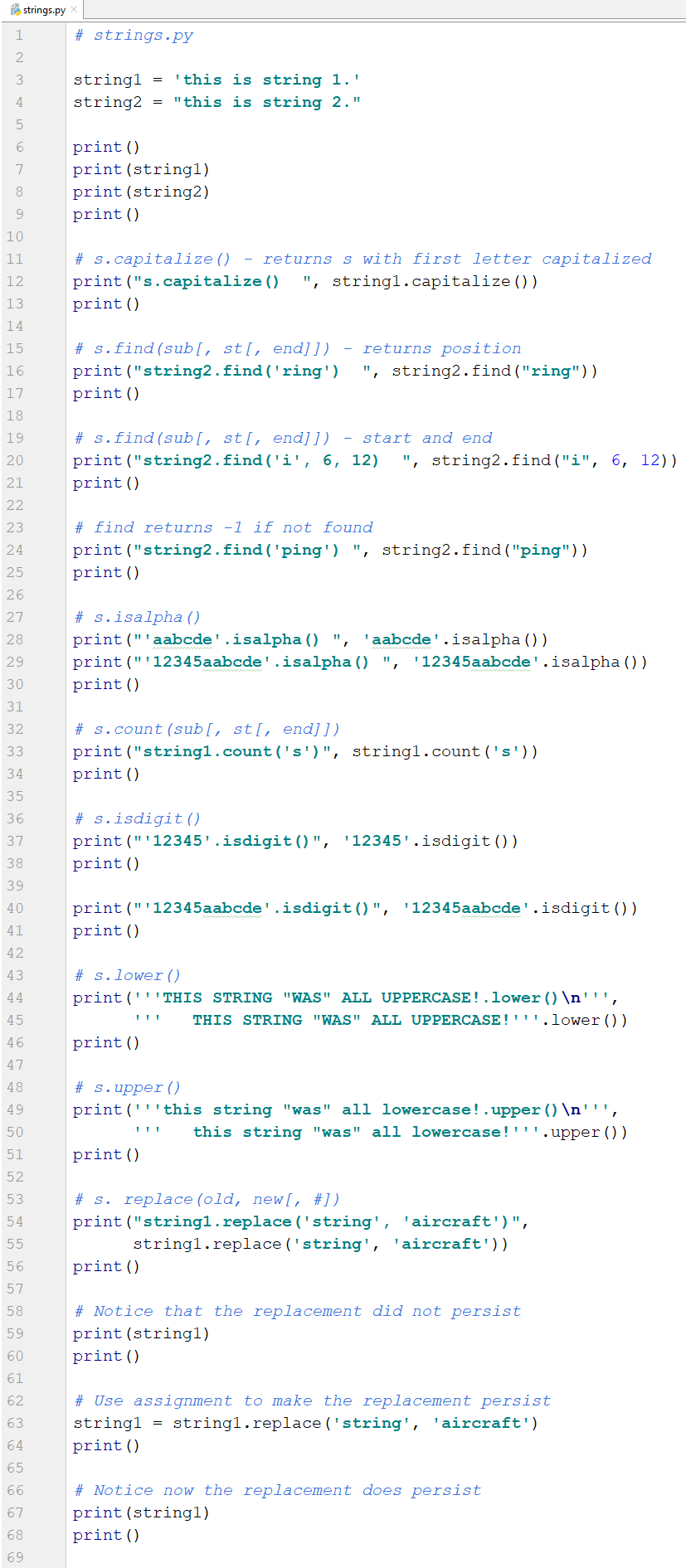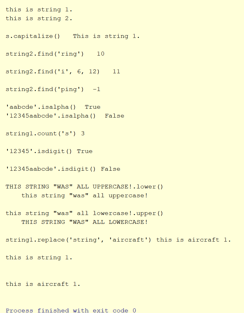 In addition to the operations common to all sequences listed in the table above and applied to tuples in the code listing, the string sequence type offers more options. Some of the string specific operations are shown in the following table and in the code example.