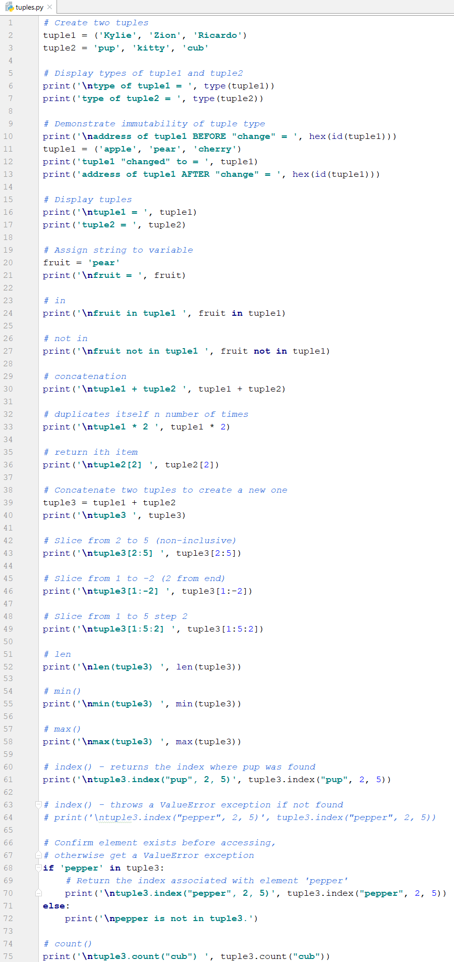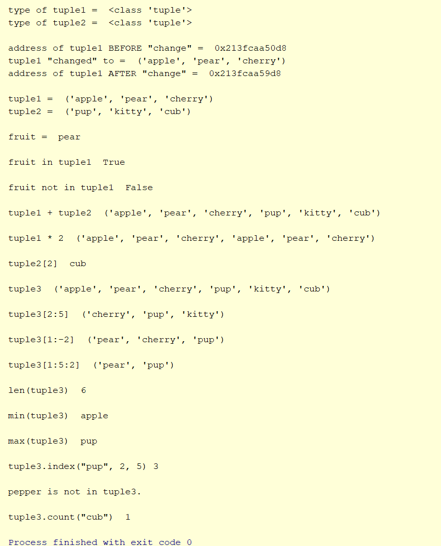 In the code example below, tuples are created and used to demonstrate the operations in the table above. It should be noted that the same operations can be performed with strings.