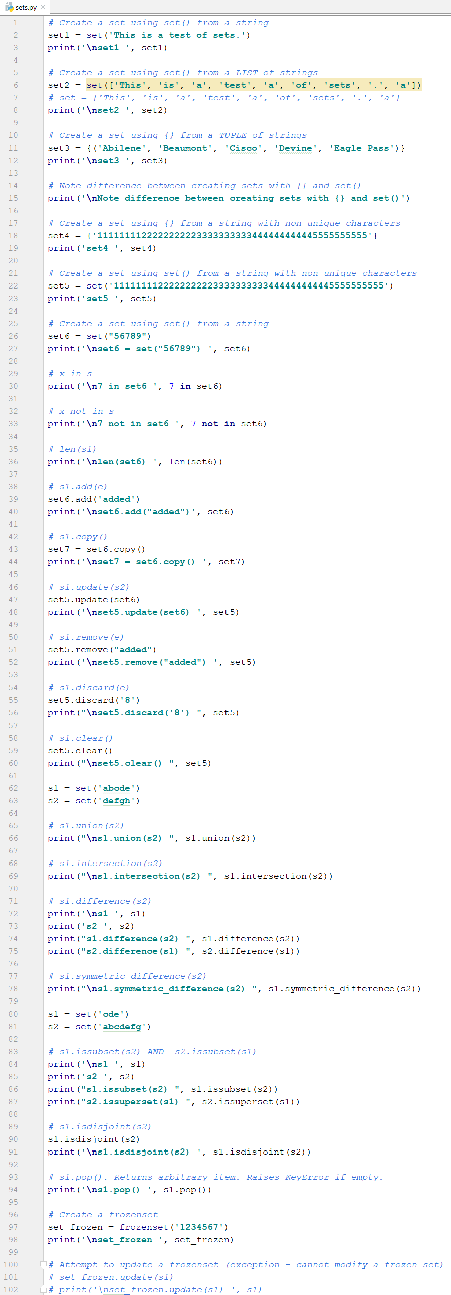 The code below demonstrates each of the set operations in the table above. s.copy() is covered more thoroughly in the chapter Copy Operations. Note the highlight added by PyCharm on line 6. This is an advisory that the function call set() on line 6 which uses the set() constructor can be replaced with a set literal. The set literal alternative is shown on line 7. Note the difference between creating sets with set literals and set constructors on lines 18 and 22.
