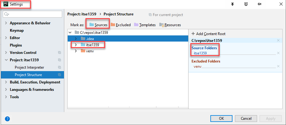 If PyCharm does not recognize your local modules, you may need to add your working folder in repos to the Project Structure as shown below. Go to File | Settings | Project : itse1359 | Project Structure and add itse1359 to your Source Folders.
