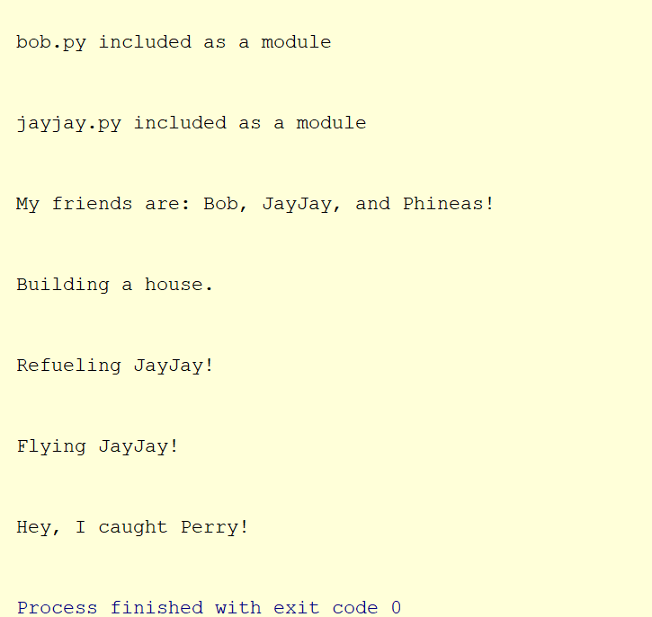 Also, the lines "bob.py inlcuded as a module" and "jayjay.py included as a module" are printed in the output. Be sure you understand why the lines were printed.