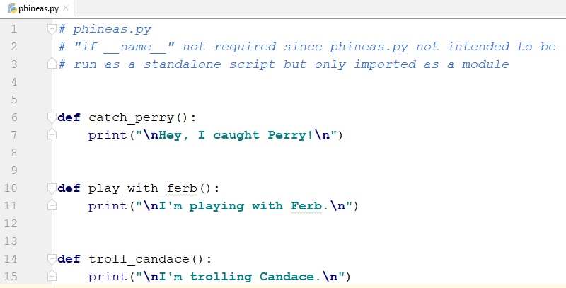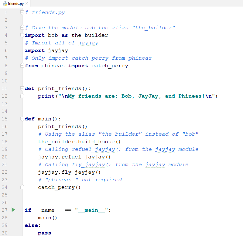 Notice that three variations of imports are shown. The module bob is assigned an alias the_builder which is used on line 18. All of the module jayjay is imported. Only catch_perry() is imported from the phineas module.