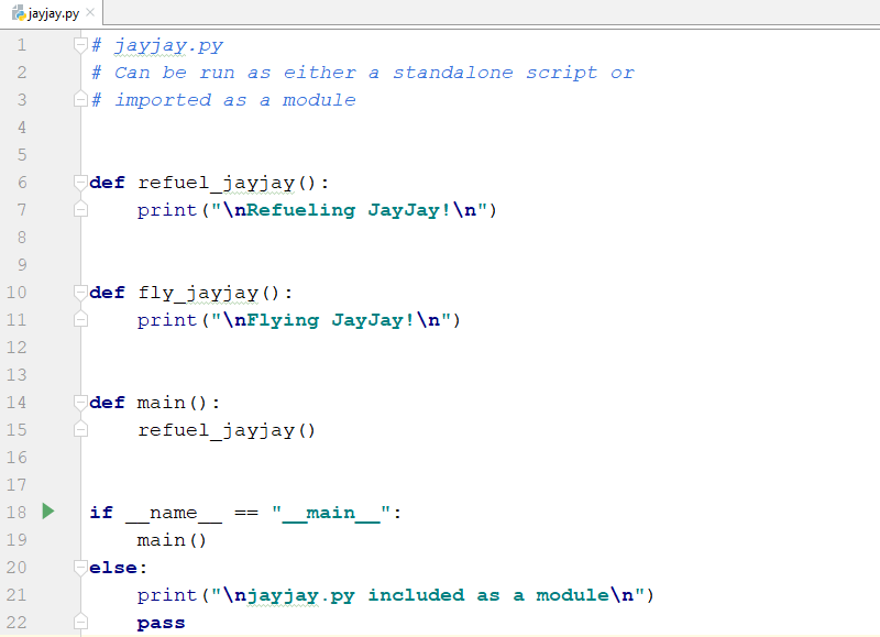 Note that bob.py and jayjay.py can also be run as standalone scripts (i.e. when running as standalone, those scripts will be named main by python). To observe the effect of not including the check for __name__ == __main__ in files that can be run as standalone, in bob.py, comment lines 19-23 and uncomment line 25. Notice the difference the in the output.