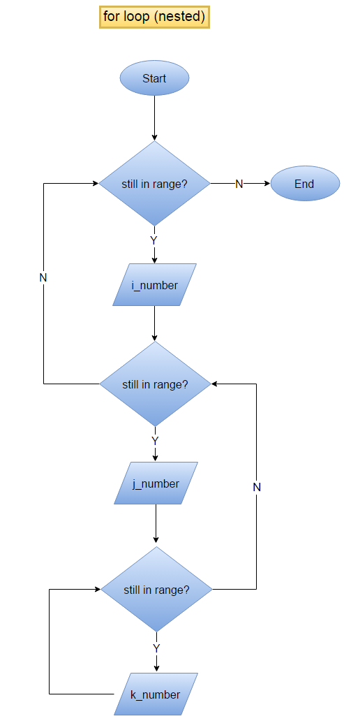 In the last section of the code a nested loop example is provided. A key point to understand about nested loops is that the inner loop iterates N number of times for every one time the outer loop iterates. This can be observed in the output produced from lines 167-185. Note in the output that i = 0 (i is the outer loop counter) while j moves from 0 to 2 and that k moves from 0 to 2 for each value of j from 0 to 2.
