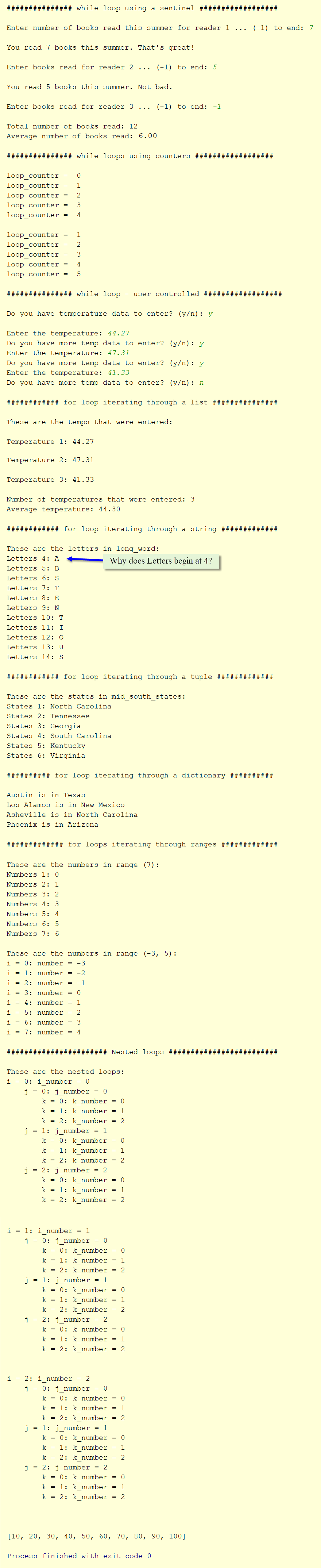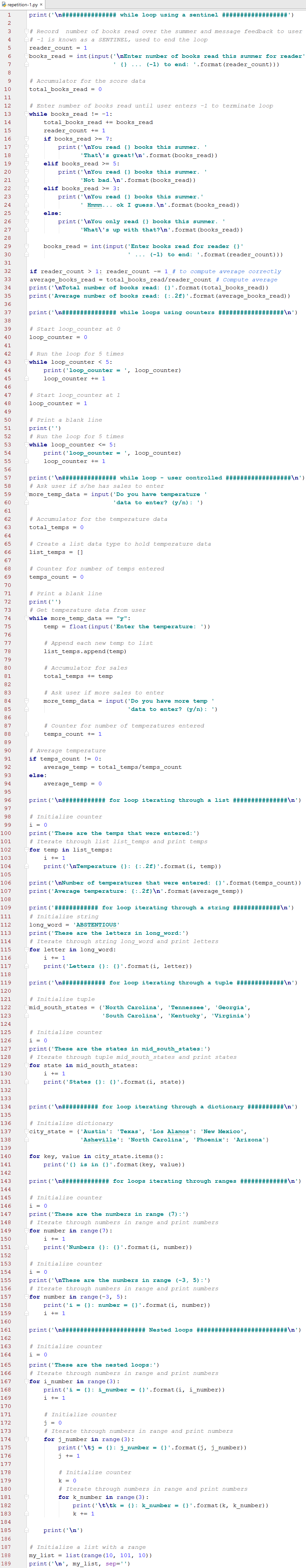 Multiple repetition control structures are demonstrated in the code listing below. Be sure to code the example and follow the output to ensure understanding.