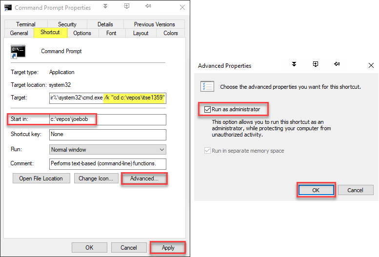 See the dialog box below. I recommend the following settings in Properties | Shortcut tab. Changing Start in: to a location most convenient for you and your workflow. Then select Advanced. Check the Run as administrator box and then OK.