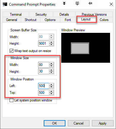 Many other settings can be configured in the Properties window. The Layout tab is selected which shows Window Size and Window Position settings.