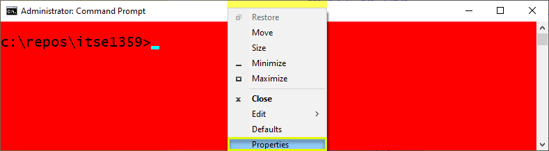 You can also apply property settings to future sessions of the Command Prompt by R-clicking on the header bar and selecting Properties. The setting changes made in the properties window will not apply to the current session but will apply to sessions that are open in the future. Notice, a soothing red was choosen for the background.