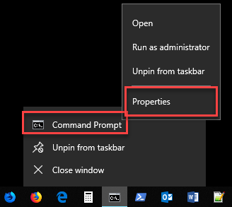 Then, R-click on the Command Prompt icon again, R-click on the Command Prompt menu item and select Properties.