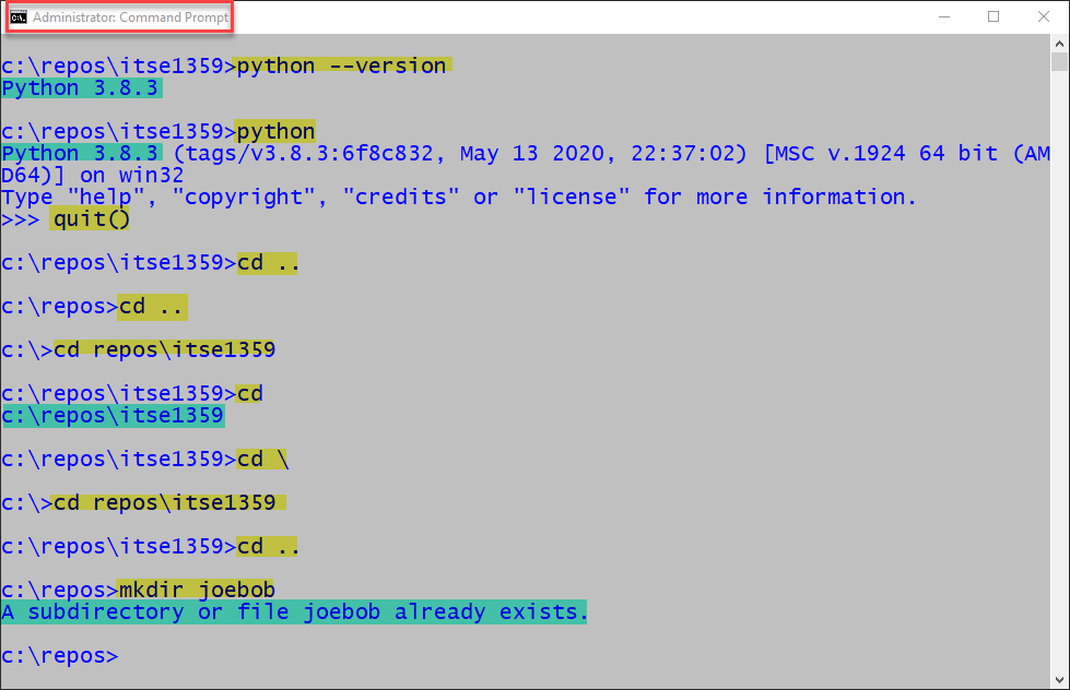 Now, click on the cmd prompt icon on the taskbar to open it. Notice that the cmd prompt runs as administrator. Type the commands as shown for practice:
