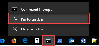 Open a Windows command prompt. R-click on the icon on the taskbar and select Pin to taskbar.