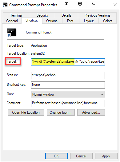 Set the Target: to: %windir%\system32\cmd.exe /k "cd c:\repos\itse1359"