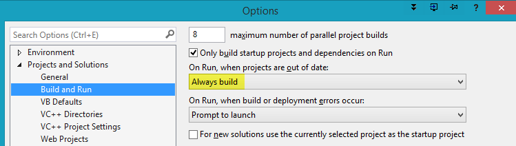 This setting will build and compile your project automatically after selecting run or debug.