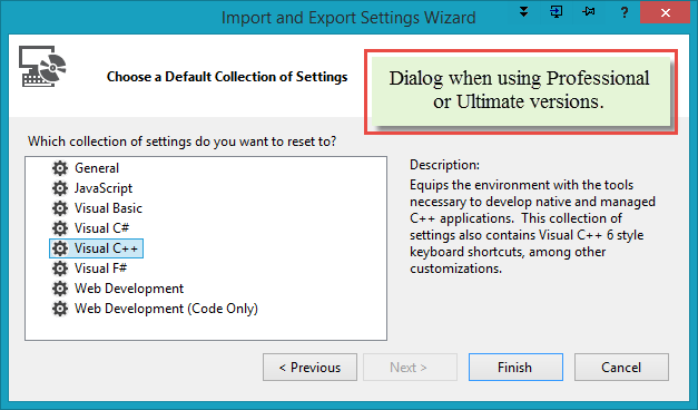 Select the VC++ environment settings. The Dark theme is preferred if working at night. Both settings can be changed later as shown in the "Configuring Visual Studio" section.