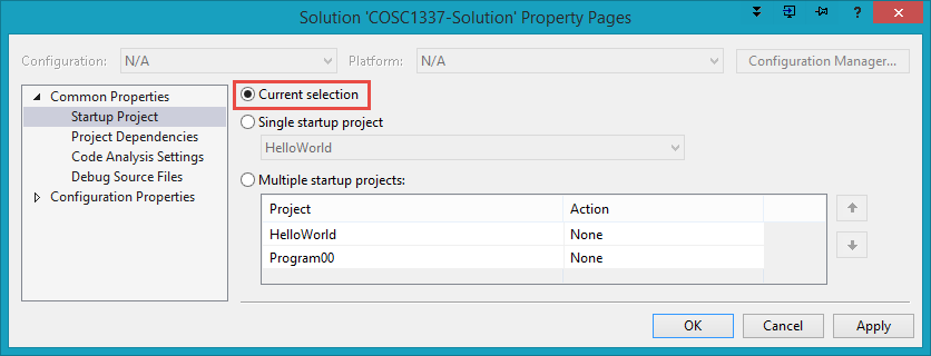 It is convenient to select a project and have it be the one that runs when F5 is pressed (debugging). To make this setting automatic, in Solution Explorer, R-click the solution | Properties | Current Selection as shown.