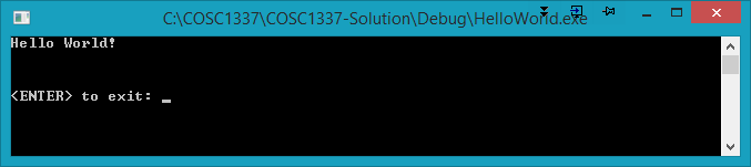 After you build/run your project (or select debug), a .exe executable file is produced. Locate your .exe program file which should be the same name as your project. In the example above it will be HelloWorld.exe. The default location of the .exe file is in the $SolutionDir/Debug folder. $(SolutionDir) is the name of your solution directory. Pay particular attention to the directory locations highlighted in the examples below. The solution directory is COSC1337-Solution. The project directory is HelloWorld. These were set in the "New Project" dialog above.