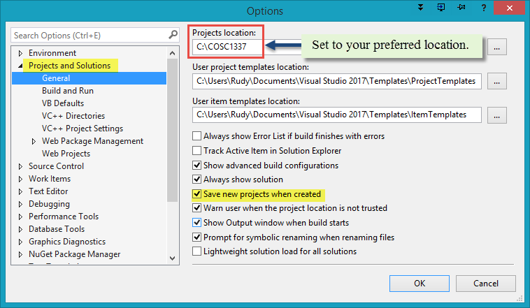 Select the default location of your projects and the “Save new…” box as shown. Note: Even though MSDN describes the "Projects location:" as being the default location of new projects, the "last used" may override this setting.