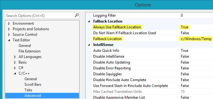 Set location of SDF files. SDF files are large files which store information for Intellisense (code completion tool).